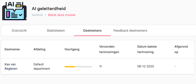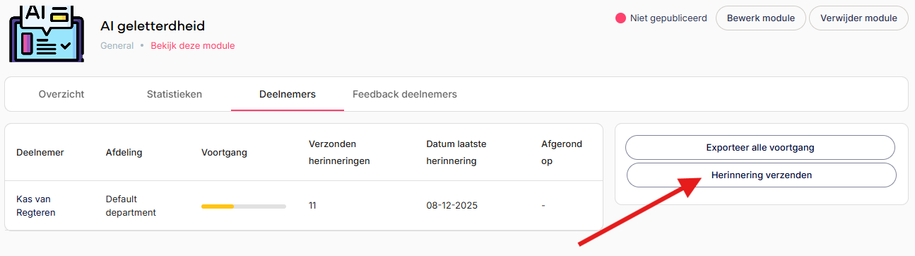 Om een herinnering te versturen ga je als beheerder of content manager naar het moduledashboard waar je de herinnering voor wilt versturen. Ga vervolgens naar het tabblad “Deelnemers”.