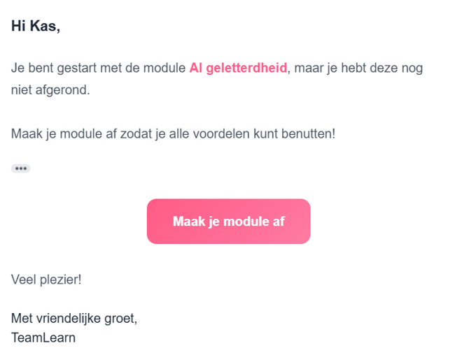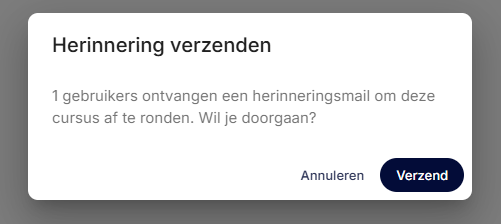 Zodra je op verzend klikt wordt er direct een mail gestuurd naar alle deelnemers die met de module zijn gestart maar deze nog niet hebben afgerond.