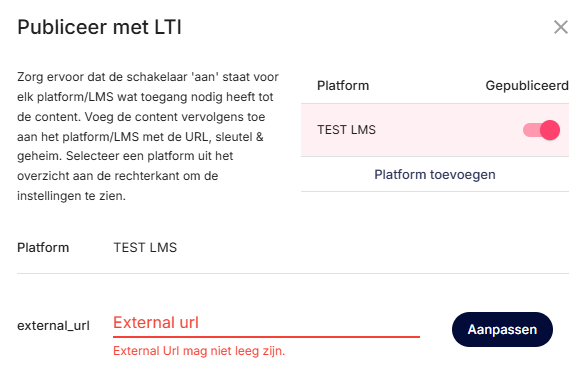 - Bovenaan staat de mogelijkheid om een URL in te vullen. Hier vul je de link in op je LMS waar de module gevonden kan worden. Dit kan elke URL zijn dus wees voorzichtig