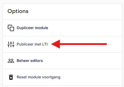 - Ga naar het moduledashboard en klik onder ‘Options’ op “publiceer met LTI”
